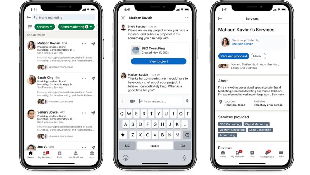 领英在去年推出了自由职业者平台Service Marketplace,让想要做自由职业打零工的用户可以给自己打广告,牵线那些寻找短期服务的项目,更好与Fiverr和Upwork竞争获得更多高技能自由职业者的青睐。