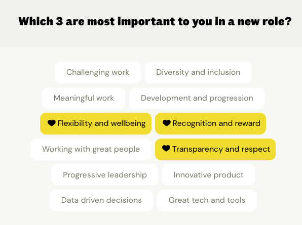 新用户注册时完成一个简单的调查问卷,回答关于求职的各种问题,其中第一个问题就是你想在新工作中获取什么,52%的用户选择工作的灵活性,40%选择工作有意义,而只有18%的用户选择了薪资最重要。