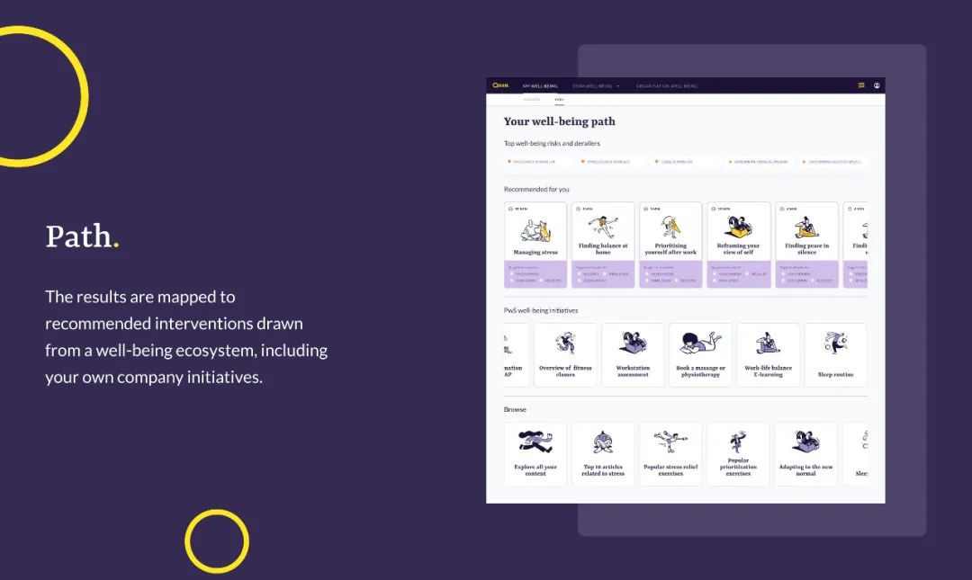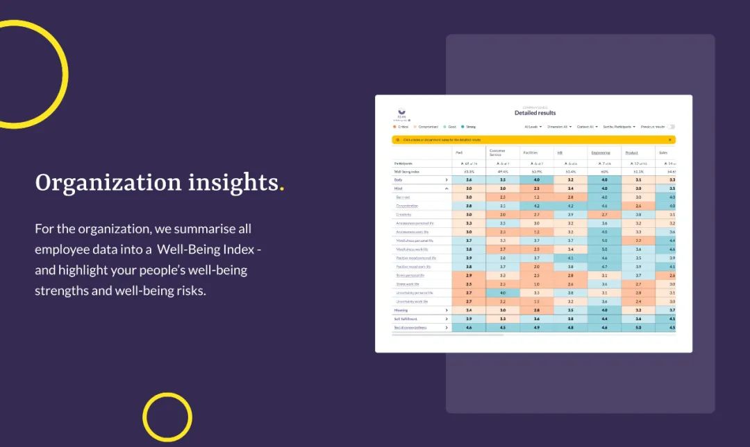 但Quan将聚光灯打在员工的个人安乐上,个人用户可以通过自测和引导衡量和提升自我心理健康,学习如何在工作中更好应用自己的长项以获得成就感和满足感;