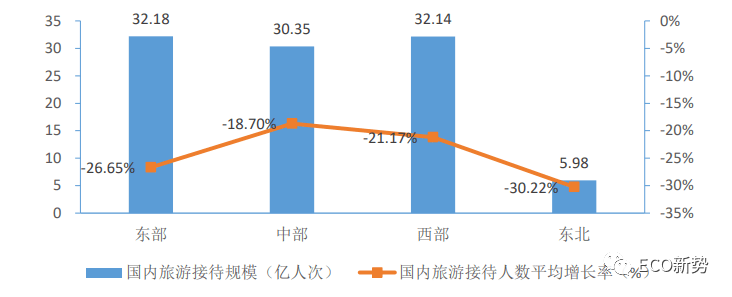 《报告》也显示,中西部区域的国内旅游接待人数增长速度更快,与东部区域的发展差距不断缩小。2020年东部、中部和西部的国内旅游接待人数分别为32.18亿人次、30.35亿人次、32.14亿人次,未来中部和西部区域的国内旅游接待人数有可能超过东部区域。