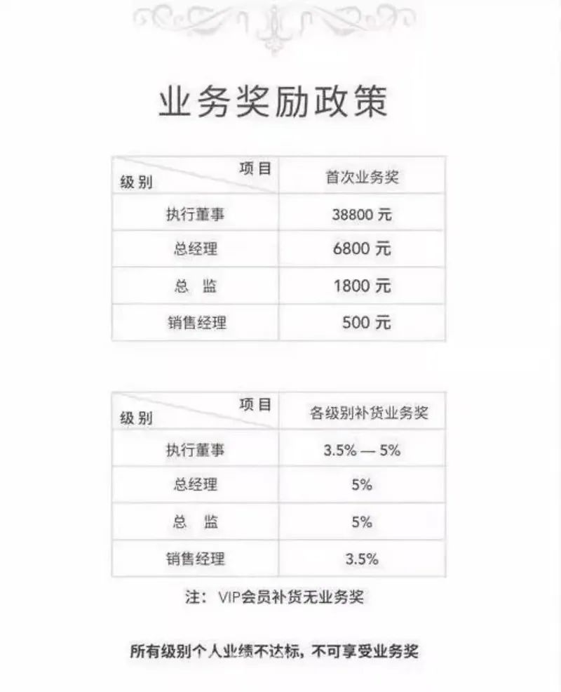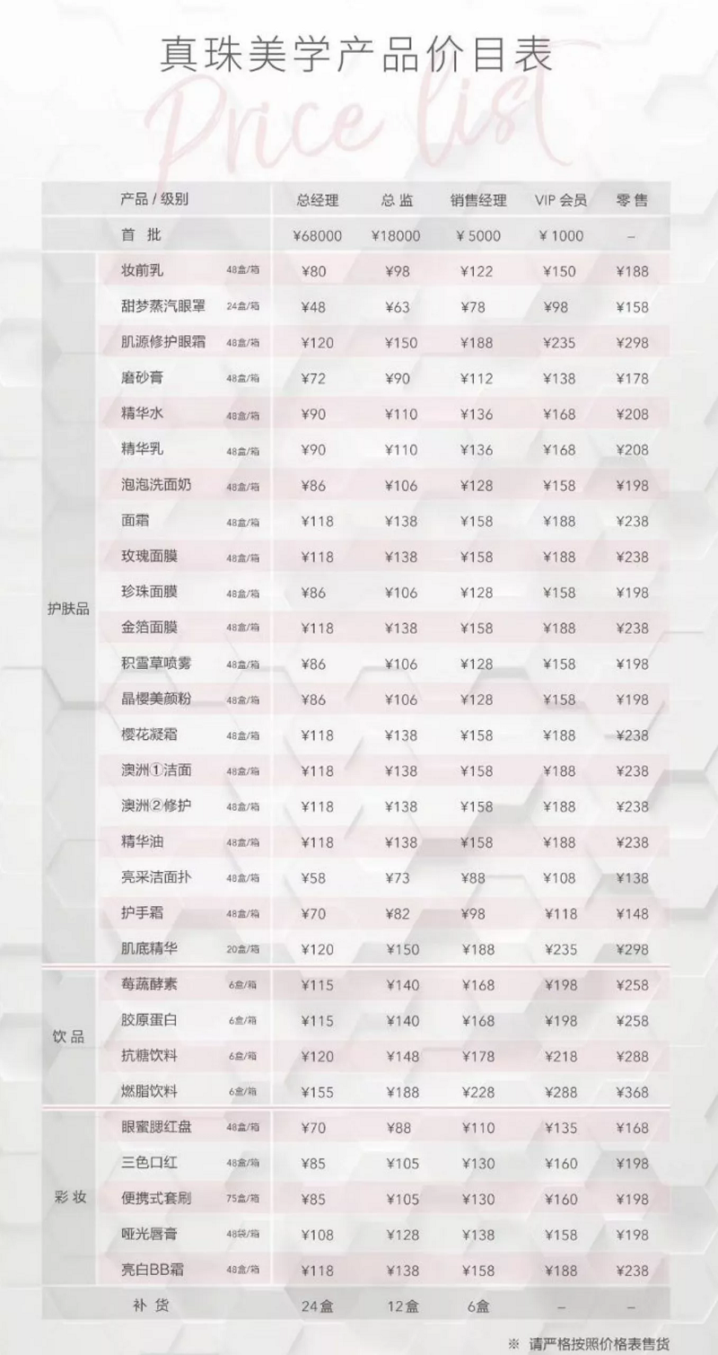 有媒体透露,真珠美学曾设置5级代理模式,分别包括VIP会员、销售经理、总监、总经理、董事。门槛费用达到一定数目即可升级,除VIP会员外,其他级别都可以招收代理商,并且不同级别的代理存在拿货差价。