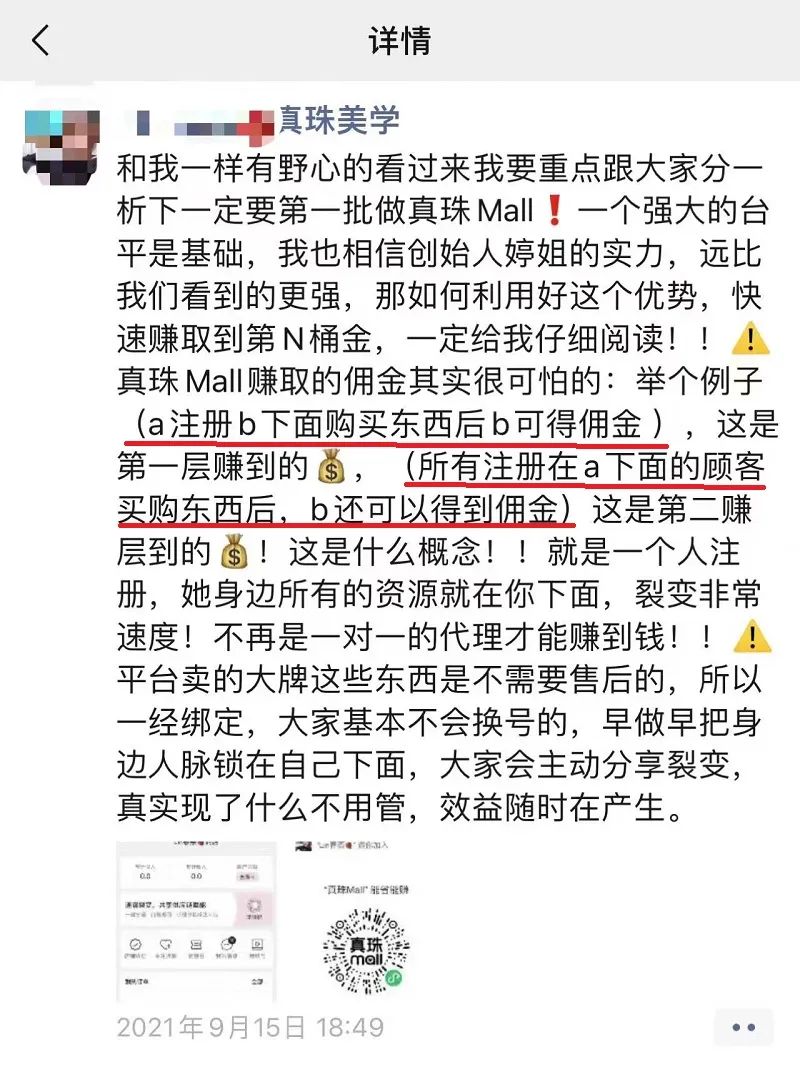 这一模式也在一些代理招募下级的朋友圈中得到验证。一位真珠美学的代理发布的朋友圈动态中称,“a注册(在)b下,购买东西后,b可以得到佣金,这是第一层;所有注册在a下的顾客购买东西后,b还能得到佣金。”