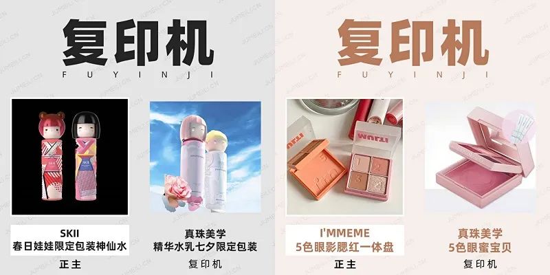 而除传销疑云外,真珠美学还有不少“黑历史”。在此前我们发布的“复印机”系列文章中(可回顾往期文章《从彩妆走向护肤,由大牌过渡到国货,复印机防不胜防》),真珠美学推出的七夕限定精华水乳套装和5色眼蜜宝贝在包装上与SKII春日限定神仙水、I'MMEME小方糖眼影腮红的设计雷同。