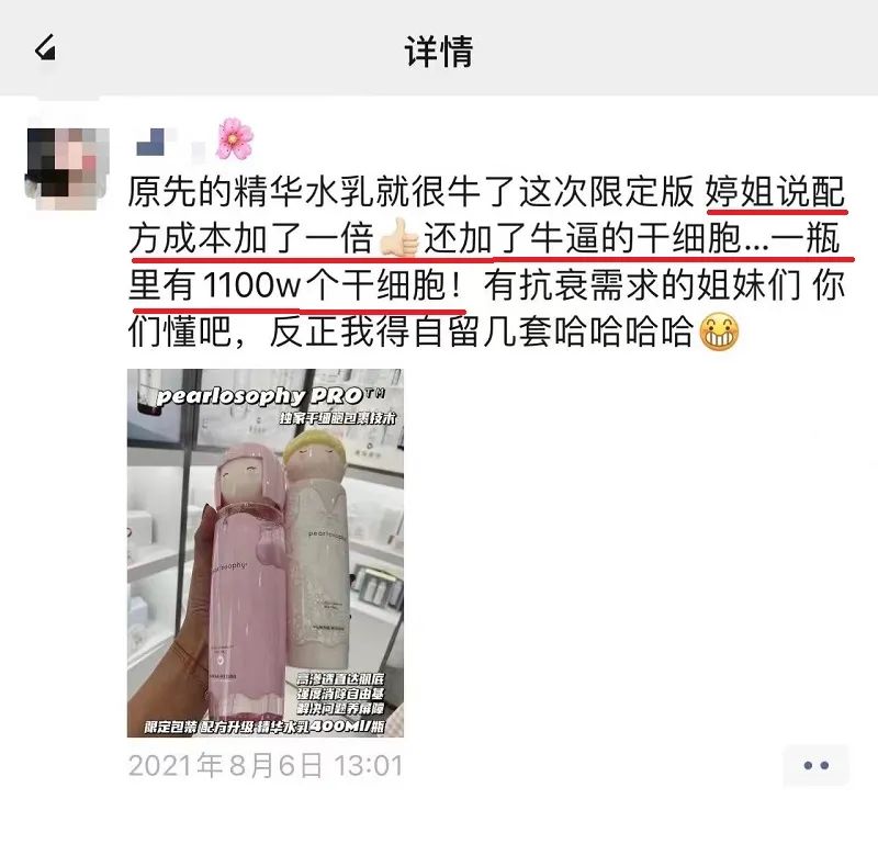 同时,此前还有媒体指出,真珠美学在介绍产品时,宣称拥有“专利原料”,但未注明专利号;还有代理在朋友圈售卖真珠美学精华水乳时,提到“婷姐(即创始人孙玉婷)说配方成本加了1倍,还加了干细胞…一瓶里有1100w个干细胞”。