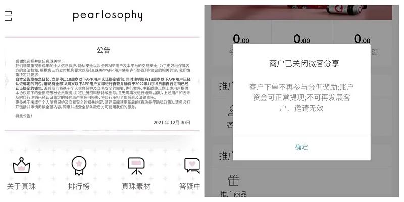 2021年12月30日,真珠美学微商城后台发布了“要求18周岁及以下APP用户注销认证钱包”的公告,并关闭了微客分享,暂停客户发展和分佣奖励。