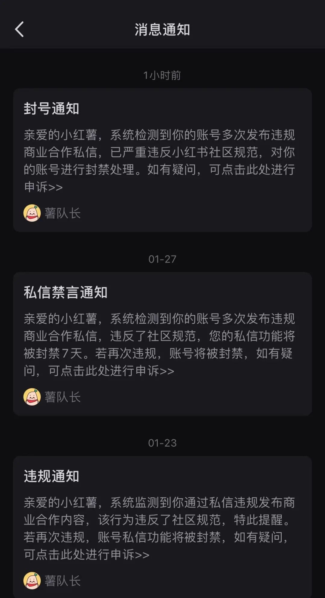 近日,有不少品牌方吐槽在小红书平台私聊博主后被禁言7天甚至被封号。根据某品牌pr的小红书截图显示“系统检测到你的账号多次发布违规商业合作私信,以严重违反小红书社区规范,对你的账号进行封禁处理。”