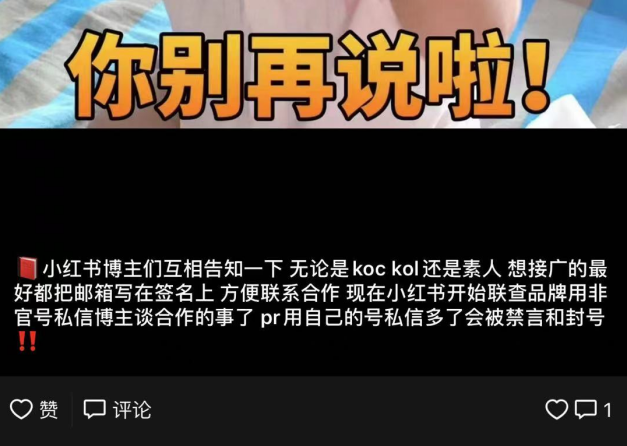 另外一位从事于小红书品牌投放的Ken同样跟记者无奈地说:“目前小红书平台私聊禁言的规定,在去年年初的时候我们也遇到过,目前只能是通过邮箱以及之前合作过的博主机构相互介绍新的合作对象。本质上还是小红书平台的商业化还不健全,我们只能先这么做。”