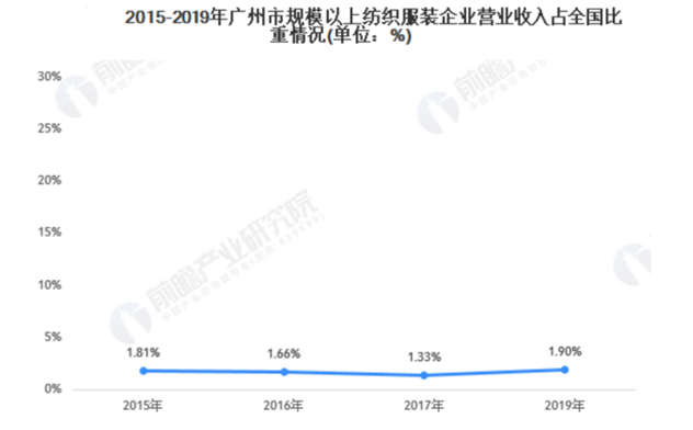 根据前瞻研究院的数据,2019年,广州服装业市场规模为1043.62亿元;但企业整体规模小,规模以上(营收2000万元以上)的纺织服装企业仅为1.9%。