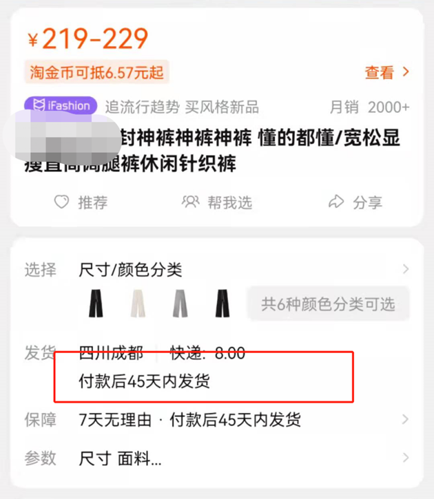 该网红店预售发货期限为45天,是非常长的期限(图源:淘宝)
