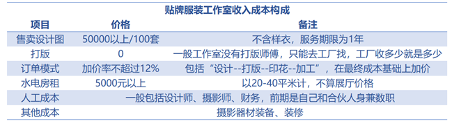 小型贴牌服装设计工作室收入成本构成(图源:五环外整理)