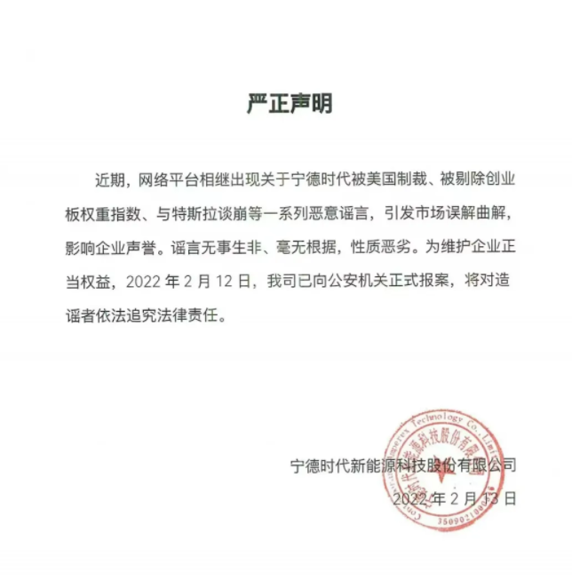 为维护企业正当权益,2022年2月12日,宁德时代已向公安机关报案,将对造谣者依法追究法律责任。