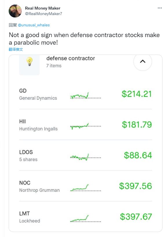 在这场混乱中,雷神公司、洛克希德·马丁、诺斯罗普·格鲁曼、通用动力等大型军火商将成为最大赢家。近期,各公司的股价不断飙升。