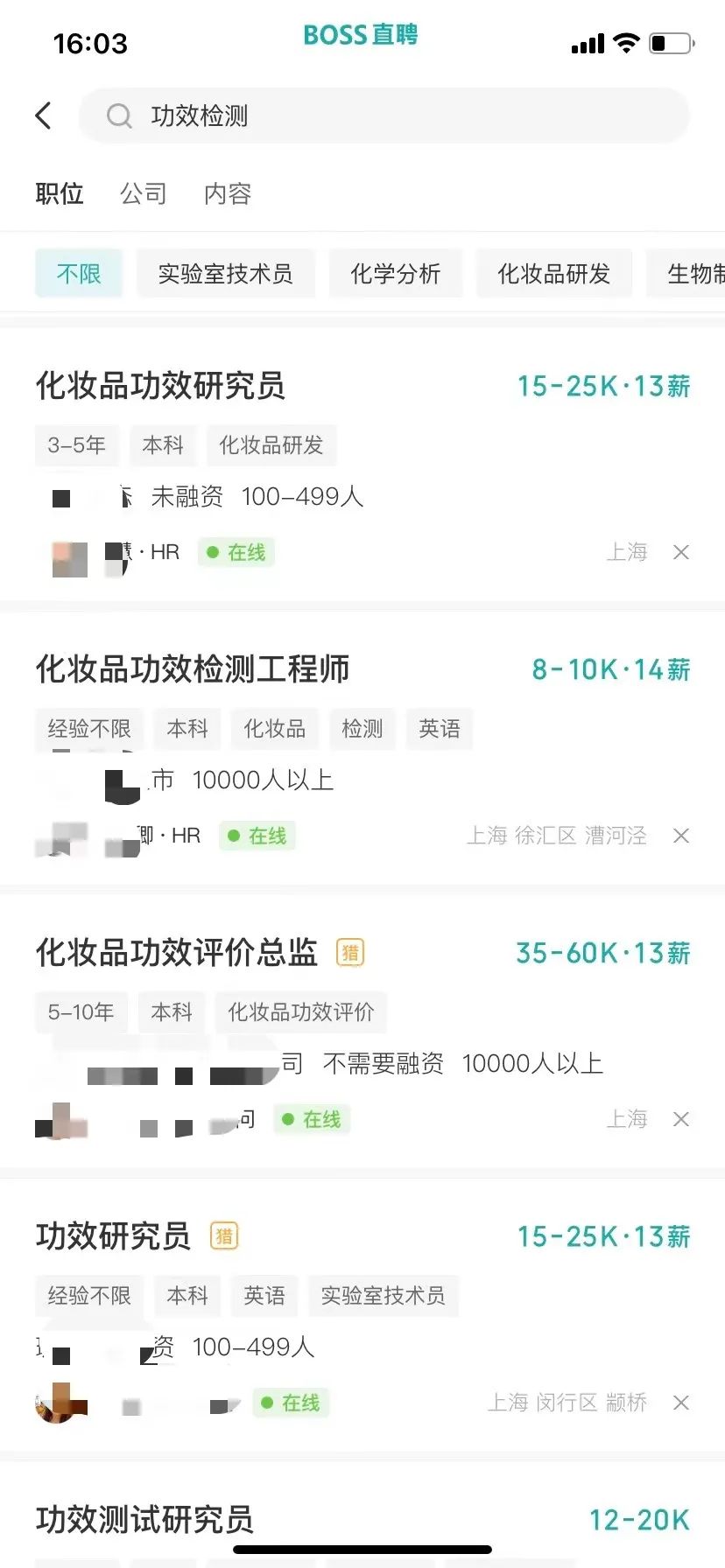 化妆品观察搜索各招聘平台发现,卡姿兰集团(香港)有限公司、伽蓝(集团)股份有限公司、贝泰妮集团等纷纷在各招聘平台上发布了功效检测员、化妆品功效评价等岗位。