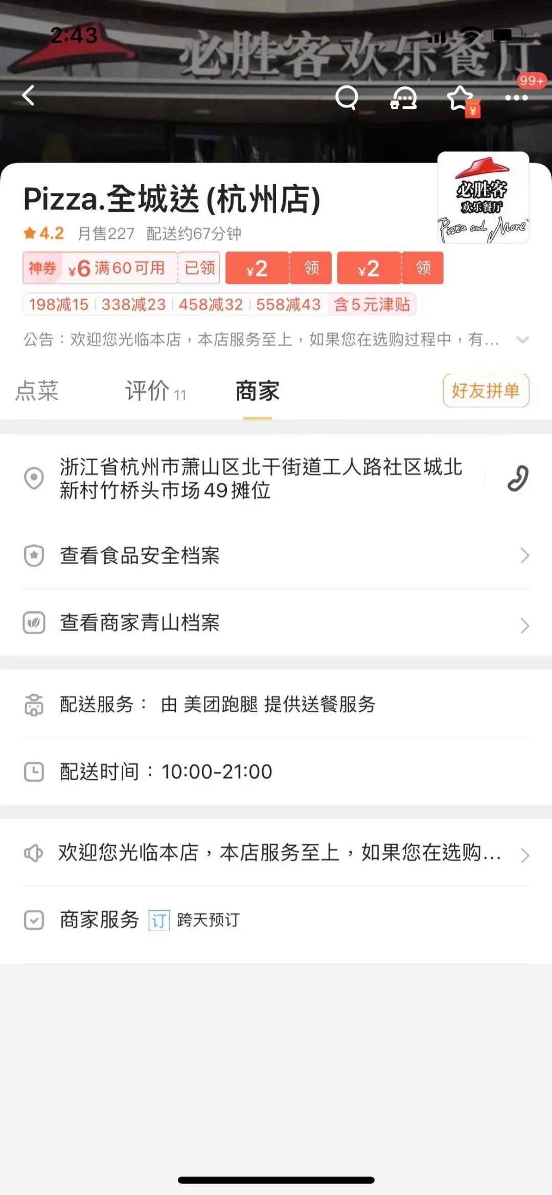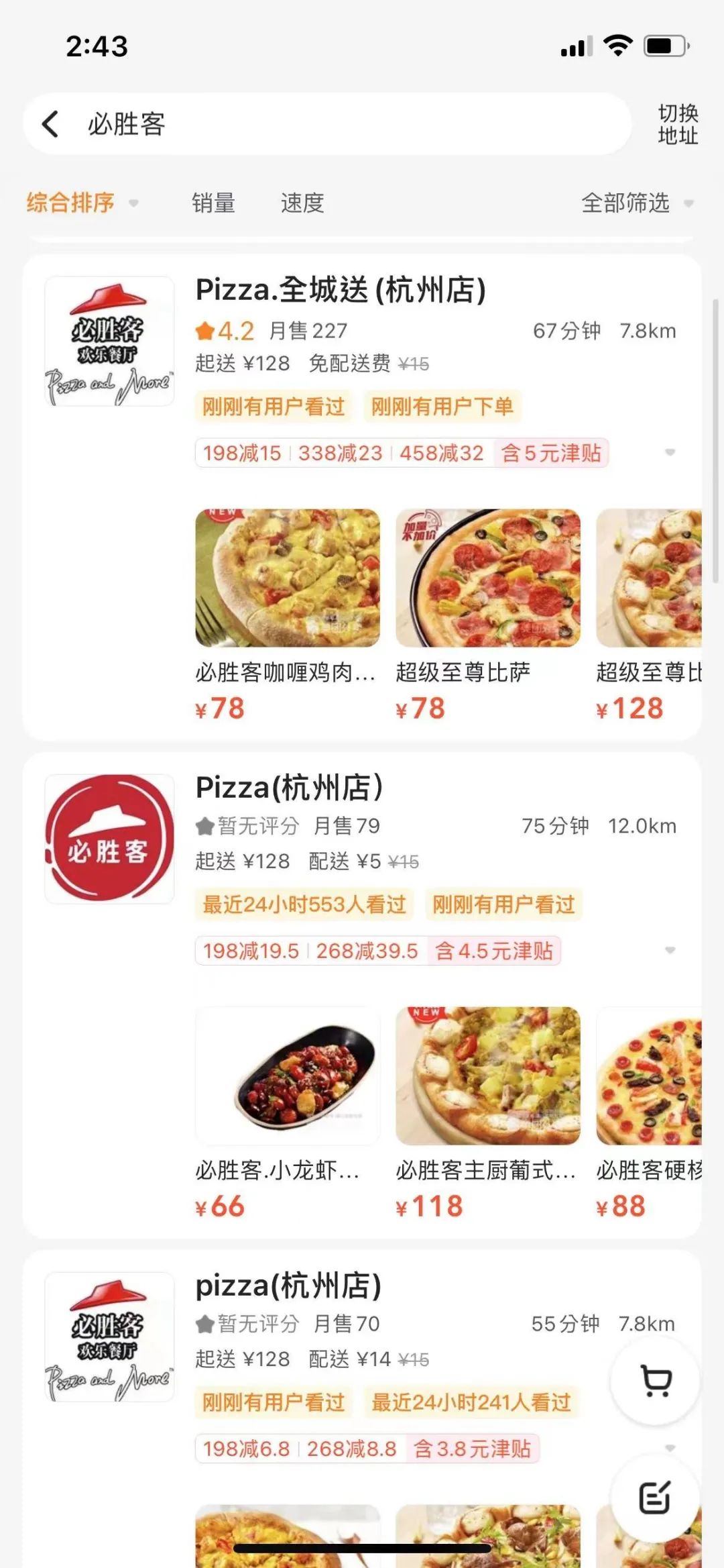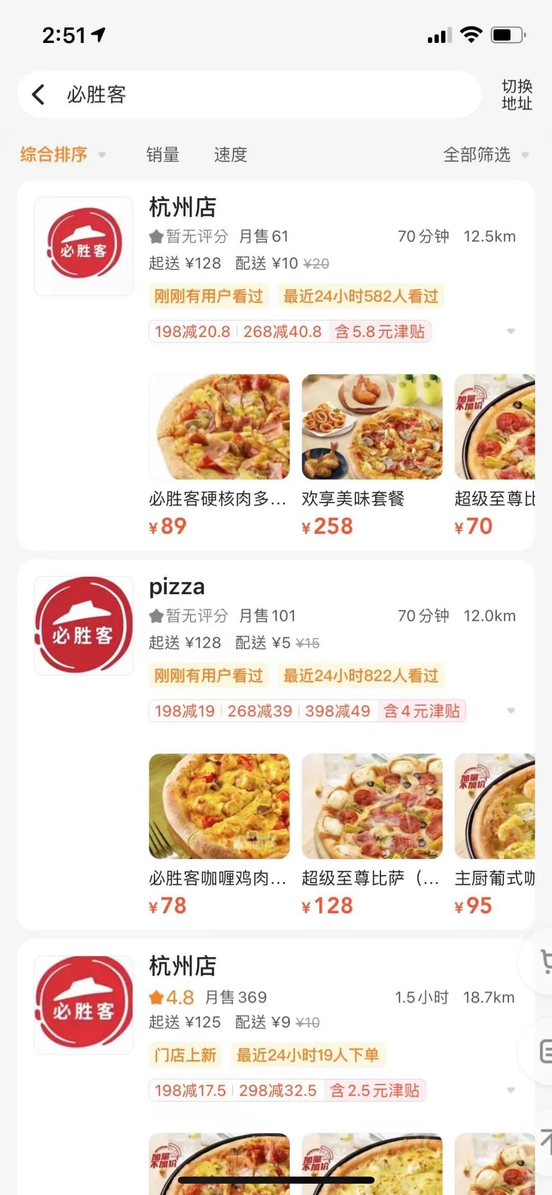 于是,在新一线城市杭州,在繁华的滨江区,我们打开美团,输入了“必胜客”进行搜索。