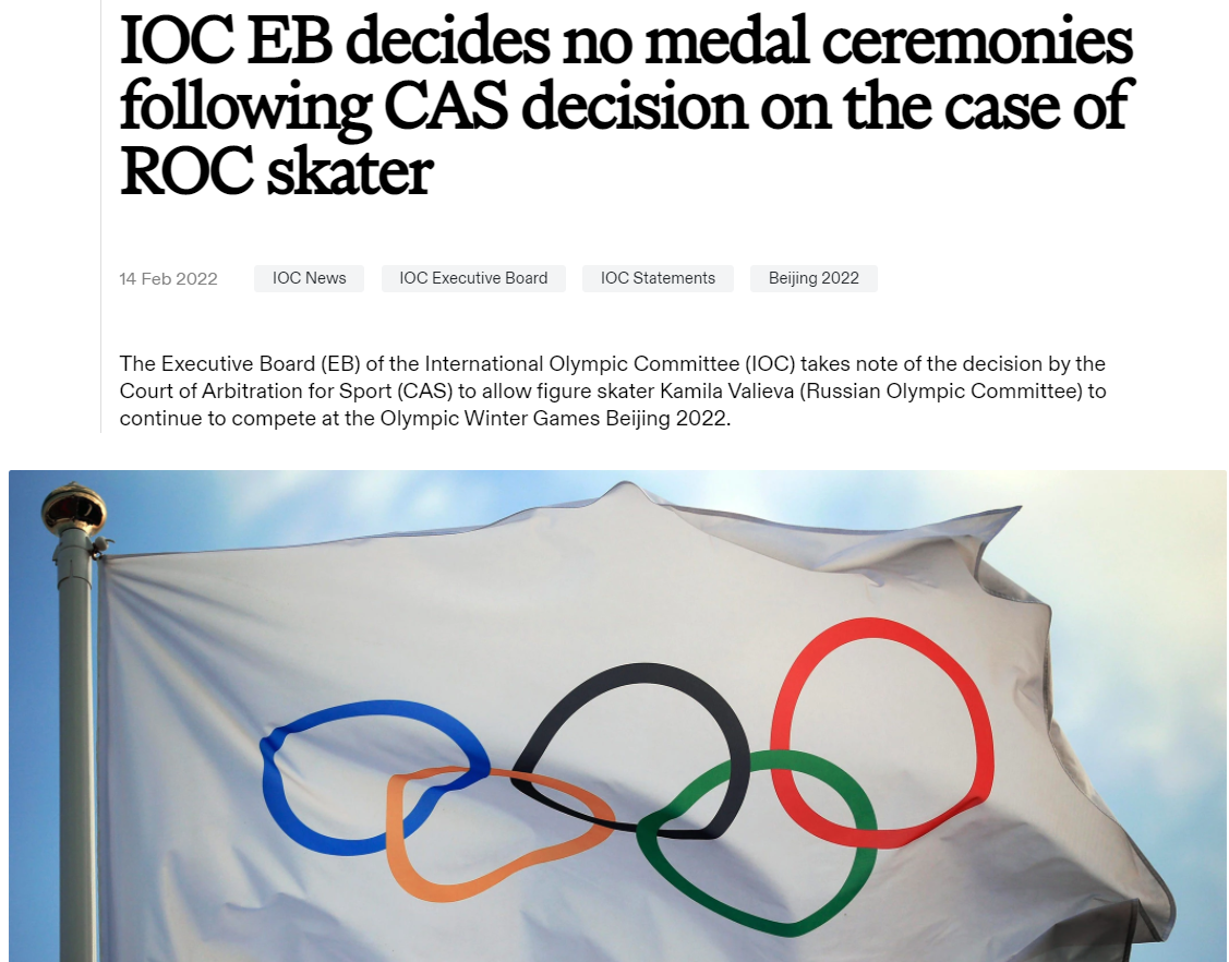 国际奥委会官网2月14日发布声明称,国际奥委会执行委员会注意到国际体育仲裁法庭允许俄罗斯花滑女选手卡米拉·瓦利耶娃继续参加2022年北京冬奥会的决定。
