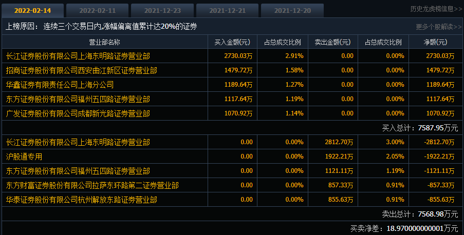 在2月14日涨停后,游资对中铝国际的看法出现分歧。当日龙虎榜显示,买入前五的长江证券股份有限公司上海东明路证券营业部、招商证券股份有限公司西安曲江新区证券营业部等均无卖出;而卖出前五的长江证券股份有限公司上海东明路证券营业部、沪股通专用同样没有买入。
