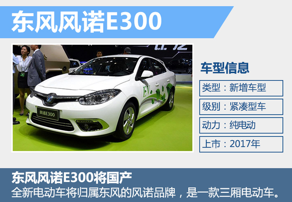 车身长、宽、高分别为4,748*1,813*1,458毫米,轴距达到2,701毫米。此外,由于采用电池组后置的布局方式,后备箱容积将有所影响。新车预计在2017年投产,将归属东风的风诺品牌,车辆标识将使用东风的“双飞燕”,是一款三厢电动车(即风诺E300)。