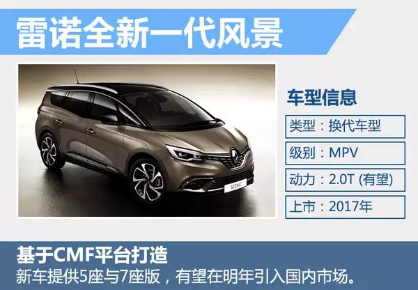 雷诺全新大风景于今年3月在日内瓦车展首秀,并有望在明年引入国内市场,新车基于CMF平台打造,同时提供5座与7座版本。前脸部分延续全新风景相同的家族式设计,头灯为全LED光源,并集成有LED日间行车灯。此外,相比全新风景在车身长度方面增加240毫米,并且在车顶增加吸顶式金属行李架。