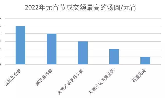 国内消费数据显示,2022年元宵节前,组合装汤圆最畅销,奥巧馅、咸味汤圆高倍数增长;单口味的汤圆商品中,黑芝麻、花生、黄米汤圆成交额最高;很多人选择自己动手做汤圆,糯米粉、黑芝麻、红豆沙等汤圆馅料的成交额同比增长91%;大餐是节日必备,猪牛羊肉消费增5倍,车厘子成交额增3倍;节日氛围型消费也很火,彩灯消费增5倍,DIY灯笼成交额翻倍;元宵节人们跨省送“关怀”,跨省份的异地订单中,健康服务、生鲜消费增长超过100%。