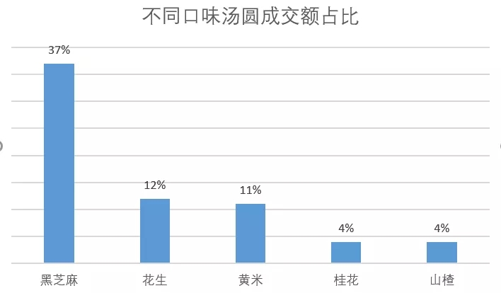 在各种口味的汤圆中,销售冠军还是黑芝麻汤圆,成交额占比37%;其次是花生、黄米汤圆,成交额占比超过10%;桂花汤圆、山楂汤圆成交额占比超过4%。
