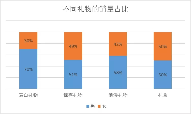 在不同用途的礼物选择上,男性消费了70%的表白类商品,很多男性利用情人节的时机送礼物表白。同时,男性在选购惊喜、浪漫礼物的占比也高于女性。但是,在礼盒的消费中,男性、女性的占比都是50%,过节送出一份充满仪式感的心意是一样的。