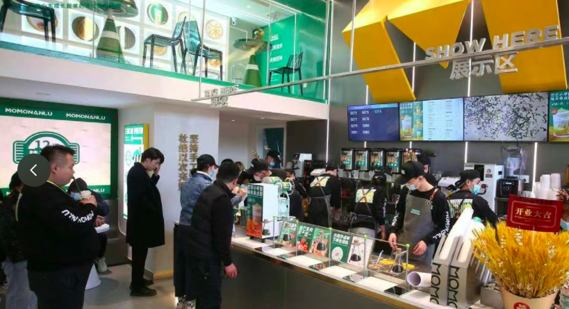 再比如莫沫南路,这个来自山东的水果茶品牌,去年完成了品牌升级,做了全新的定位,在临沂开了家200平的旗舰店,最高日出1200多杯,日营业额近3万元,一跃成为当地奶茶街的流量明星。