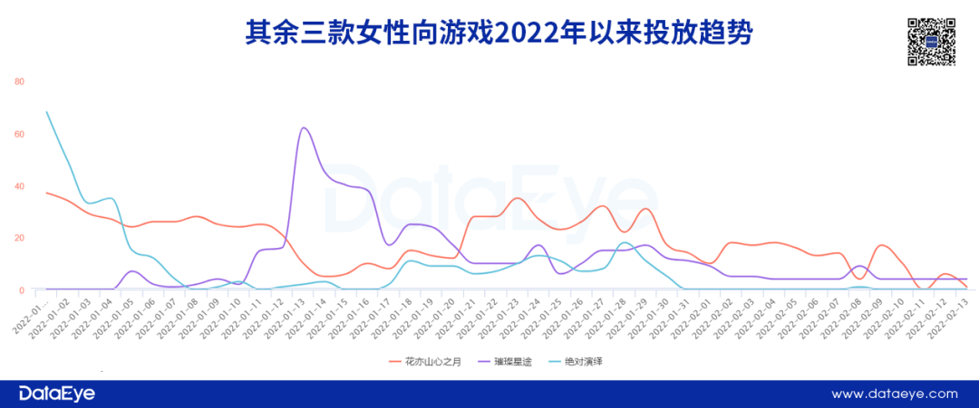 相比之下,三巨头对旗下的女性向游戏显得不太上心。《璀璨星途》、《绝对演绎》、《花亦山心之月》在春节期间投放素材量较低,日均投放素材数在20组以下,甚至不及同题材投放中位数。