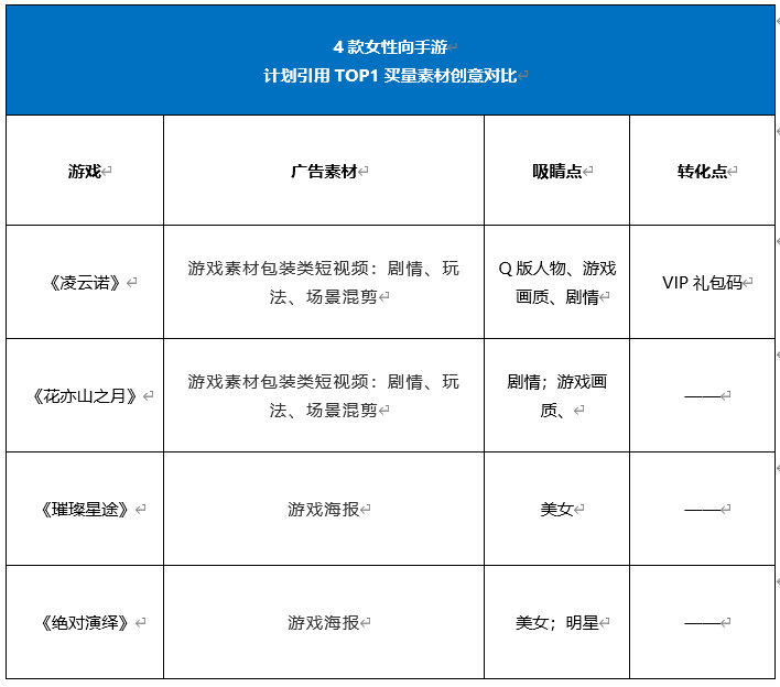 从创意素材的表现形式来看,女性向游戏计划使用TOP1为游戏素材包装短视频和图片素材等主流素材。