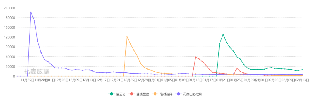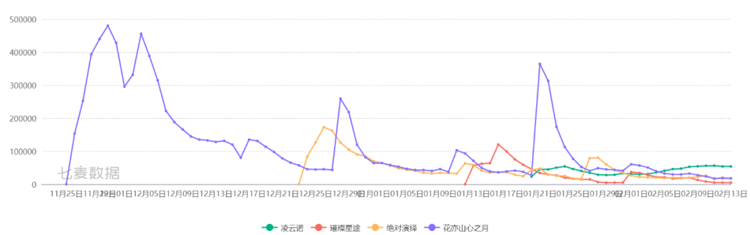 通过上文分析,我们可以看出,在四巨头的PK战中,《凌云诺》可谓是所向披靡,唯一的竞争对手只有字节旗下的《花亦山心之月》。