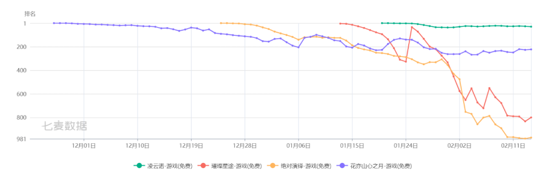 《凌云诺》目前位居游戏免费榜30名,其余三款游戏均在200名开外,《花亦山心之月》排名相对靠前,排在200名左右,《绝对演绎》和《璀璨星途》已经跌出600名之外。