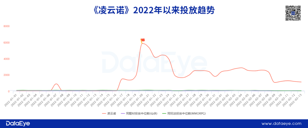 《凌云诺》上线当日(1月20日)投放素材数高达5835组,远超同期女性向游戏《花亦山心之月》、《绝对演绎》、《璀璨星途》。截至目前,《凌云诺》累计投放素材数高达17131组,已经超过2021年度买量最高的女性向游戏《光与夜之恋》。