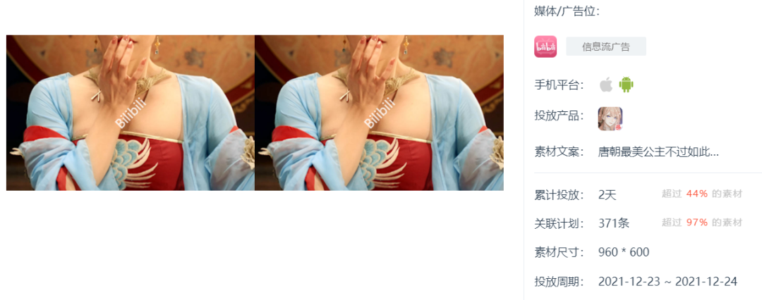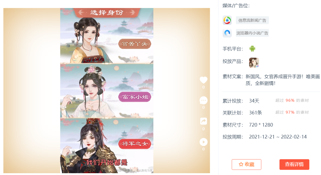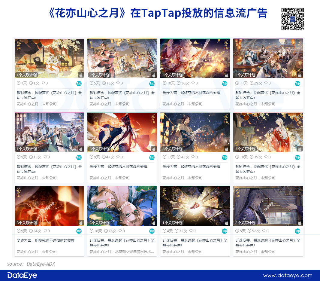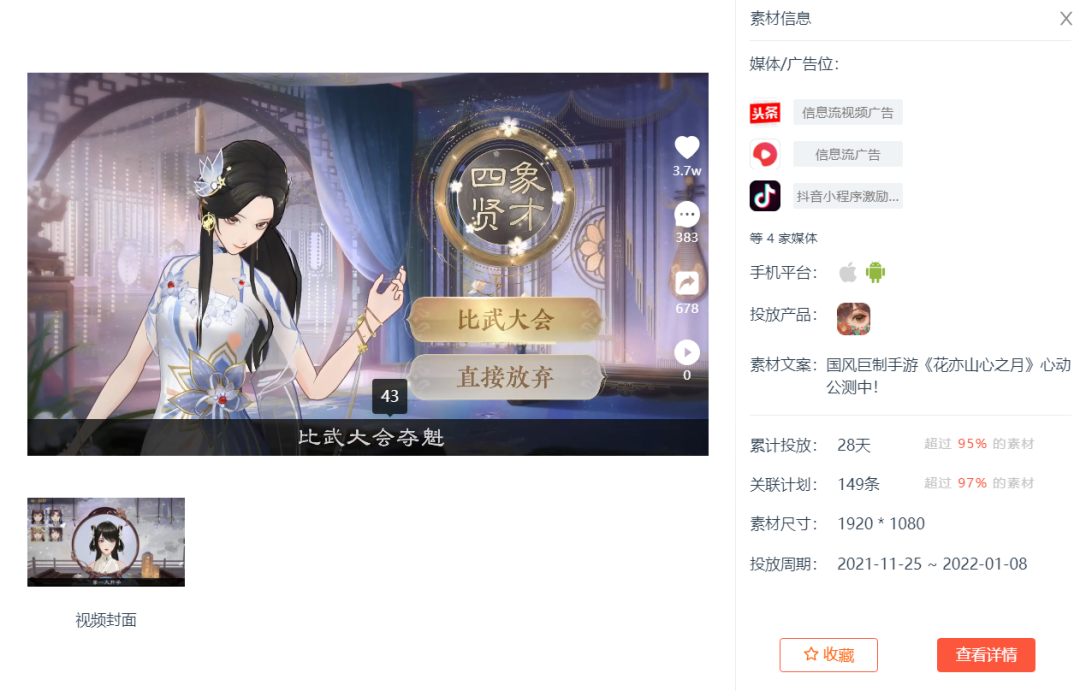 例如,《花亦山之月》计划使用TOP1来自视频素材《国风巨制手游《花亦山心之月》心动公测中!》该广告关联计划高达149条,投放于今日头条信息流视频广告,西瓜视频信息流广告及抖音小程序激励广告。