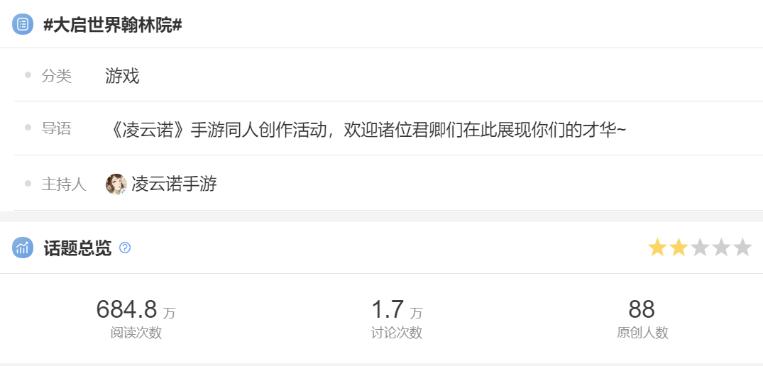 截至目前,《凌云诺》微博话题#大启世界翰林院#阅读次数达684.8万,讨论次数达1.7万次,但原创人数较少,只有88人。