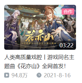 《花亦山心之月》主题曲《花亦山》由B站知名音乐UP主赵方婧演唱,官方视频在B站播放量超过94万。