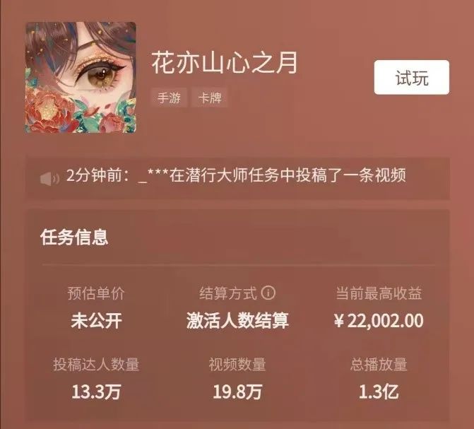 除了达人直播,作为字节跳动亲儿子,《花亦山心之月》还通过抖音游戏人发行计划,吸引了超过13.3万个达人进行投稿,相关视频数量超19.8万,内容总播放超1.3亿次。