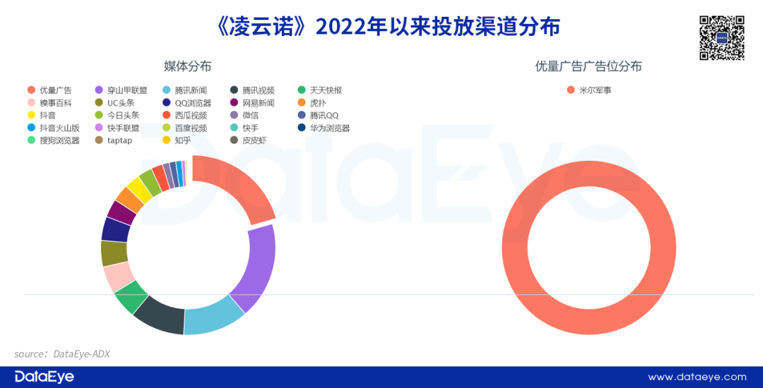 以“买量大户”《凌云诺》为例,2022年以来投放渠道高达24个,Top3渠道为优量广告、穿山甲联盟和腾讯新闻,三大渠道占比过半,优量广告的重点广告位为“米尔军事”。