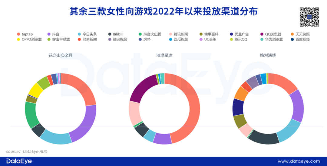 从投放渠道来看,女性向游戏在买量较低的情况下依然覆盖多个渠道,此外,TapTap、B站等新兴渠道愈发受到女性向厂商重视。