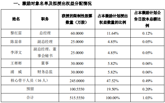 本激励计划拟授予激励对象的限制性股票数量为515.56万股,约占总股本的1.03%。以最新股价计算,对应市值约3629.51万元。
