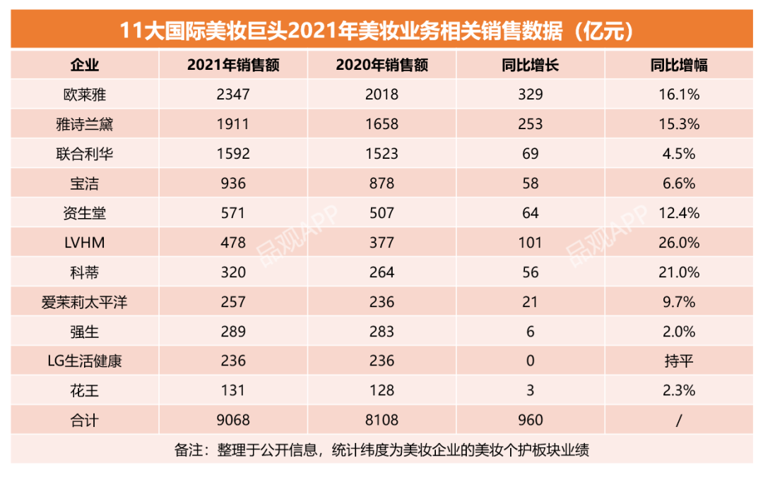整体上看,与去年同期相比,这11家国际巨头的美妆业务共计卖出了9068亿元,增长了约11%,不少企业几乎恢复至2019年疫情前业绩水平。