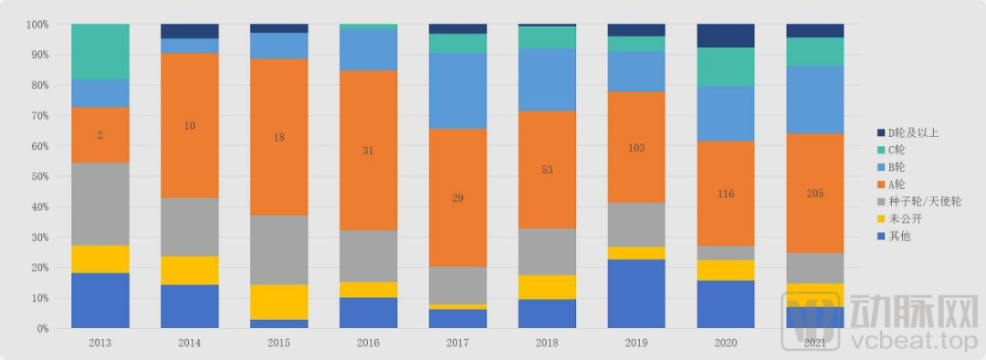 2021年我国一级市场投融资事件轮次分布比例 数据来源:动脉橙数据库