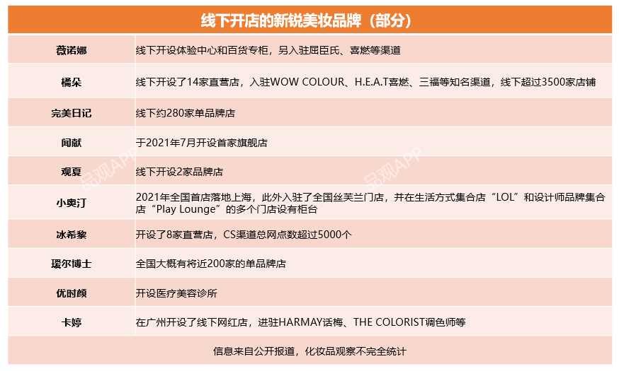 仅在2021年下半年,就有观夏、闻献、薇诺娜、小奥汀、橘朵等品牌,在线下开设直营店,而选择入驻美妆集合店的新锐品牌则多不胜数。