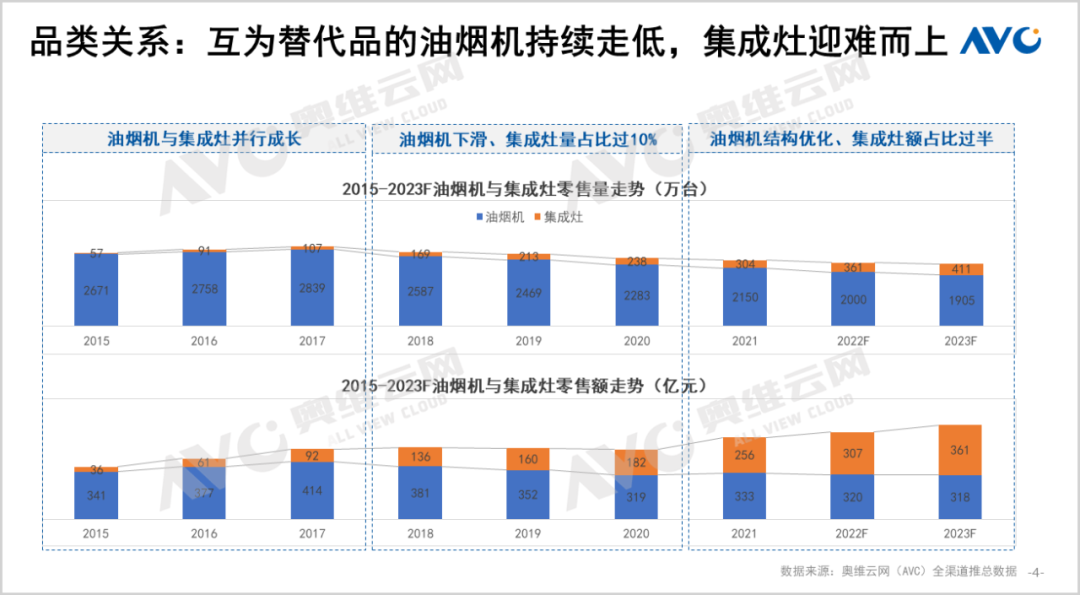 一降一升之间,集成灶对油烟机的替代效应清晰可见。