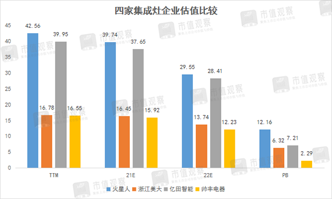 有意思的是,市场并没有按照现有的规模排序对四家企业进行估值。相反,市场赋予的估值顺序依次是火星人>亿田智能>浙江美大>帅丰电器。