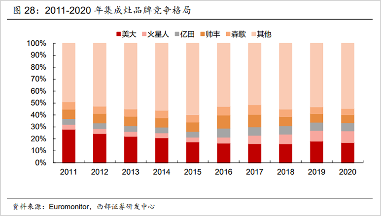 具体来看,据欧睿咨询统计,2020年浙江美大的市占率为17%、火星人为10%、亿田智能与帅丰电器均为7%。