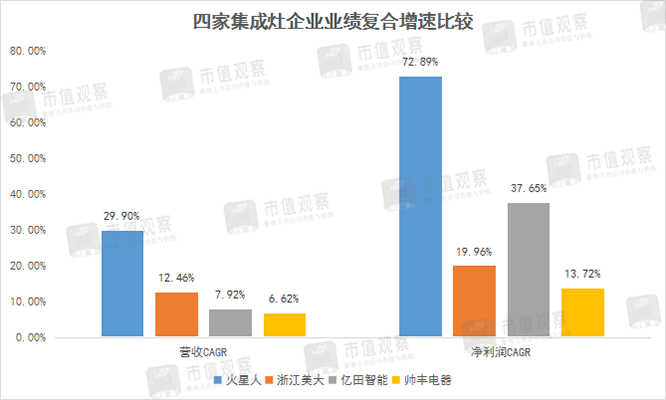具体而言,2018年-2020年,火星人净利润年复合增速高达72.89%,亿田智能次之为37.65%;浙江美大与帅丰电器净利润复合增速分别为19.96%与13.72%。