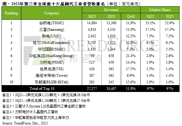 根据市场咨询公司TrendForce的数据,高塔半导体是2021年第三季度全球排名第九的晶圆代工厂商,全球市场份额1.4%。