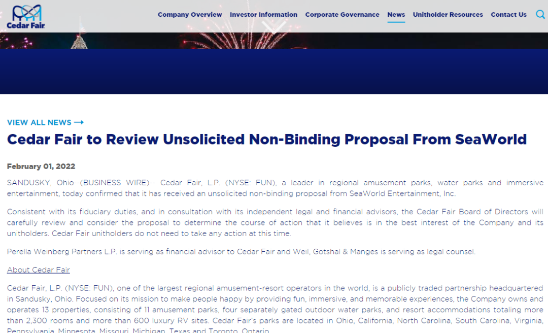 据消息人士透露,雪松会娱乐正在考虑上述报价,但不确定最终能否达成交易。不过,与2019年六旗娱乐拟以每股70美元、总价40亿美元报价收购雪松会不同,彼时的雪松会并不积极,而最近雪松会发布公告确认收到海洋世界的收购要约,并在考虑海洋世界这份"主动、没有法律约束性"的报价。甚至,雪松会请的两家咨询机构已公布Perella Weinberg Partners LP 和Weil Gotshal &Manges LLP。这与2019年雪松会娱乐并未发布任何公告有很大的不同。