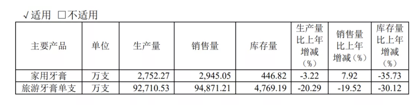 据公开数据显示,2020年,两面针总共卖出95462.8万支牙膏,其中家用牙膏2752.27万支、旅游牙膏92710.53万支。