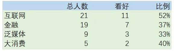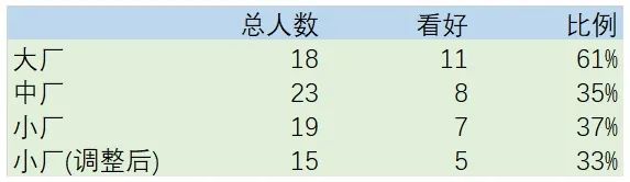 从下表可以看到,大厂员工看好自家公司的比例本来就是最高的,达到61%;中厂员工看好自家公司的只有35%;小厂员工倒是有37%看好自家公司,不过这里有一定的欺骗性——如果我们去掉4位“小厂老板”(老板天然具备乐观倾向),那么小厂员工就只有33%看好自家公司了,与中厂相仿。