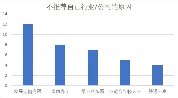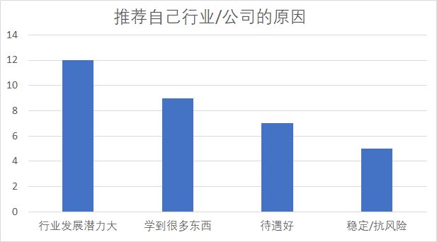 话说回来,还是有接近一半的人推荐加入自己的行业。他们的主要理由是:行业发展潜力大;能学到很多东西;待遇比较好;稳定/有抗风险能力。其实,“内卷”本身就是行业僧多粥少的体现,所以无论推不推荐自己的行业,大家归根结底最关心的还是行业发展潜力。所谓“学到很多东西”,也要建立在行业有发展的基础上——对于做了几年就被迫转行的人而言,在第一份工作学到的东西可能没有价值。